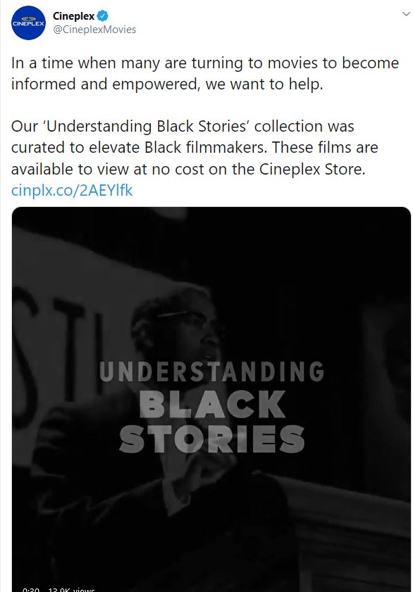 With all the tension about racism recently this was interesting to see as Cineplex is apparently offering people the opportunity to watch movies for free on its site that relate to the topic of black people in the community. There are quite a bit of movies to choose from as well. As stated in one of its social media posts: