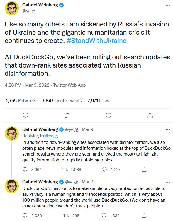 This was a fascinating story I though where there is a search engine called DuckDuckGo that originally promoted itself as a company that offers unbiased search results versus its competitors such as Google. That is an interesting proposition for many search engine users where many feel Google just wants to promote people they like as an example. But that’s why this was so interesting as recently the founder of the company openly expressed how they will actively down-rank sites that they deem are providing misinformation about the war between Ukraine and Russia.