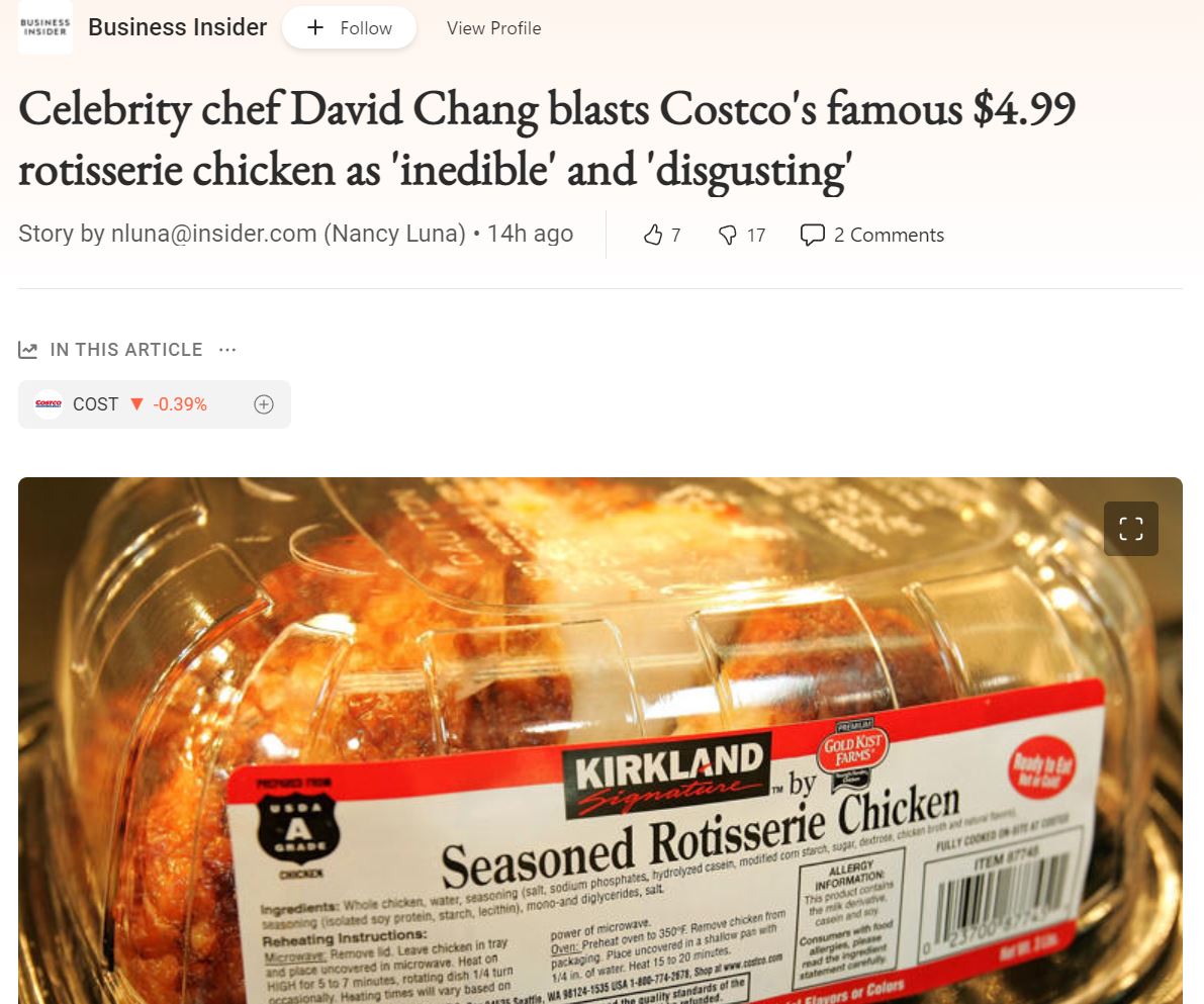 Today I read this article that was titled “Celebrity chef David Chang blasts Costco’s famous $4.99 rotisserie chicken as ‘inedible’ and ‘disgusting” where it seems like a typical scenario where someone with a lot of expertise in their field criticizes basic items that most people buy mostly because it is affordable. In this case Costco was the target of the criticism. While cheap hotdogs is the first thing that comes to my mind with Costco, it did make me wonder where when you buy store bought meals like these chicken are you expecting a lot or it to be just good enough to consume for the cheap price?