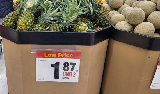 While going through the supermarket today I found so many great deals where this one for pineapples seemed almost too good where the sign mentioned it was $1.87 each with a limit of two. These normally go for over $3. They looked pretty large too without looking like they are rotten or anything. But you can see as well a lot of them didn’t look ripe yet which may be the reason for the steep discount.