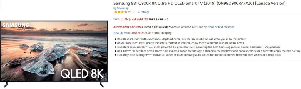 That’s why when I saw this price for a TV listed at almost $100,000 I had to do a double take. Was this TV really that expensive? Was it a price error in a good or bad way? I honestly have never seen this specific model before. As upon searching for it at other stores, sure enough the price is about the same. Just looking at this massive price tag makes me think of how many other things in life you can buy with that money. At the same time, it just naturally made me want to research prices of TV’s in general to see how expensive this really is.