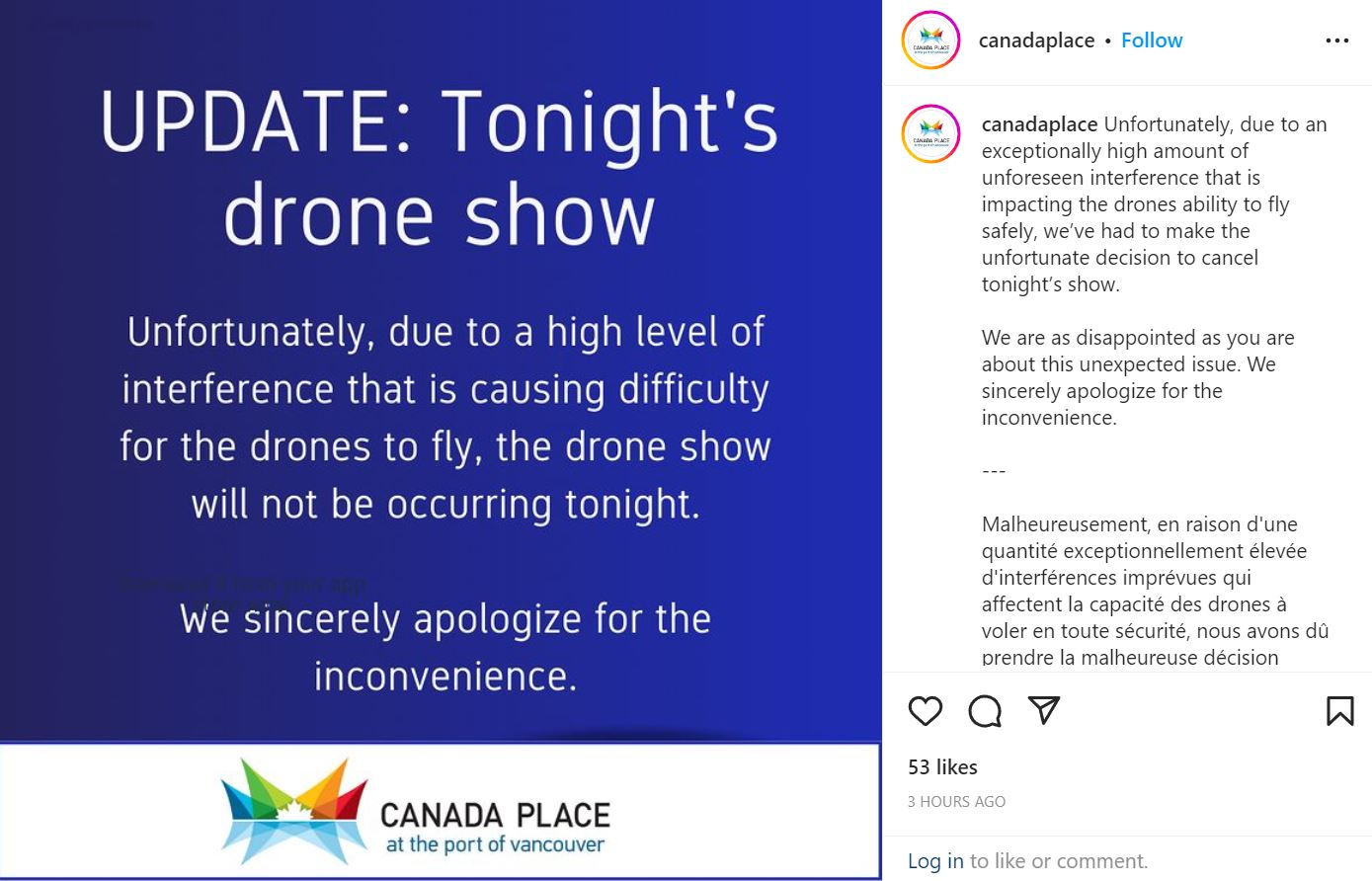 Today there was supposed to be this large drone light show around Canada Place as the company Best Buy was promoting this a lot as a first of its kind event in Vancouver with about 300 drones. Even I was curious in checking it out. By the sounds of it, this drone show was supposed to start at the beginning of the event and there were quite a few people lined up to see it. However, apparently the organizers could get the drones going and people were standing outside in the cold wondering what was going on.